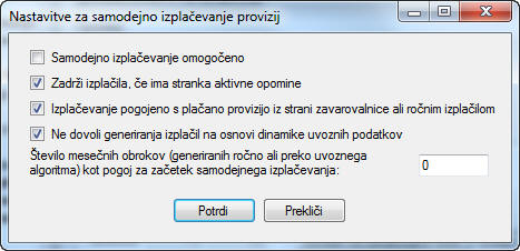 Izplačevanje pogojeno s plačano provizijo s strani zavarovalnice ali ročnim izplačilom: Če je opcija izbrana, lahko v nastavitvah dinamike izplačil pri določanju faktorja za izračun provizije nastavimo, koliko obrokov plačil mora biti plačanih iz strani zavarovalnice ali ročno dodeljenih, da program nadaljuje s samodejnimi izplačili.