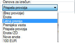Izhodna provizija je zmnožek osnove in faktorja. Osnovo za izračun izhodne provizije, ki je vedno podana v evrih, izberemo iz padajočega menija: