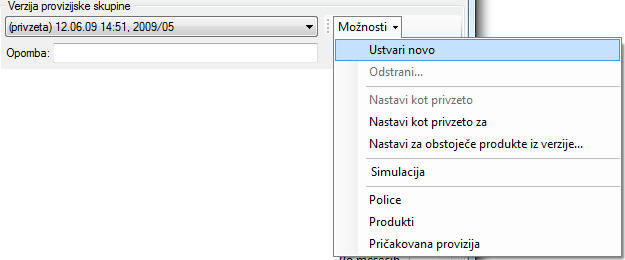 Samo ena od verzij provizijskih skupin je lahko nastavljena kot splošno privzeta. Privzeta verzija je tista, po kateri se obračunavajo nova zavarovanja. S kreiranjem novih verzij se privzeta verzija ne spremeni. Trenutno prikazano verzijo nastavimo kot privzeto tako, da v meniju izberemo Možnosti->Nastavi kot privzeto.