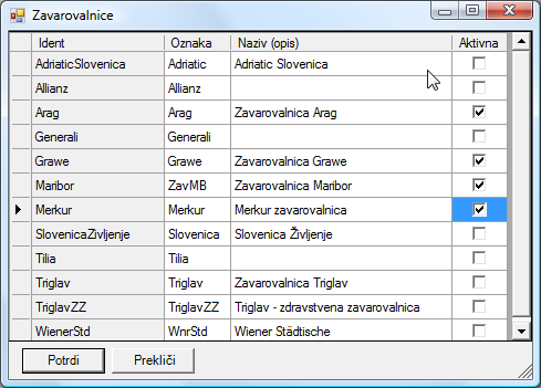 | Ident | To je interna oznaka posamezne zavarovalnice. Identa ni mogoče spreminjati. |