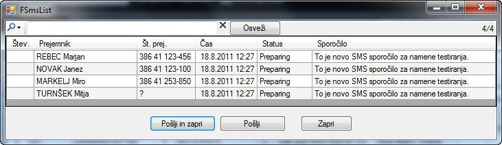Ko so sporočila pripravljena, jih lahko pošljemo. Če izberemo gumb Pošlji, se bodo odposlala vsa še ne poslana sporočila, ki vsebujejo popolne podatki. Če izberemo gumb Pošlji in zapri, se bo zaprlo tudi okno z novimi sporočili. Če izberemo gumb Zapri, se bo zaprlo okno, neposlana sporočila pa bodo zavržena.